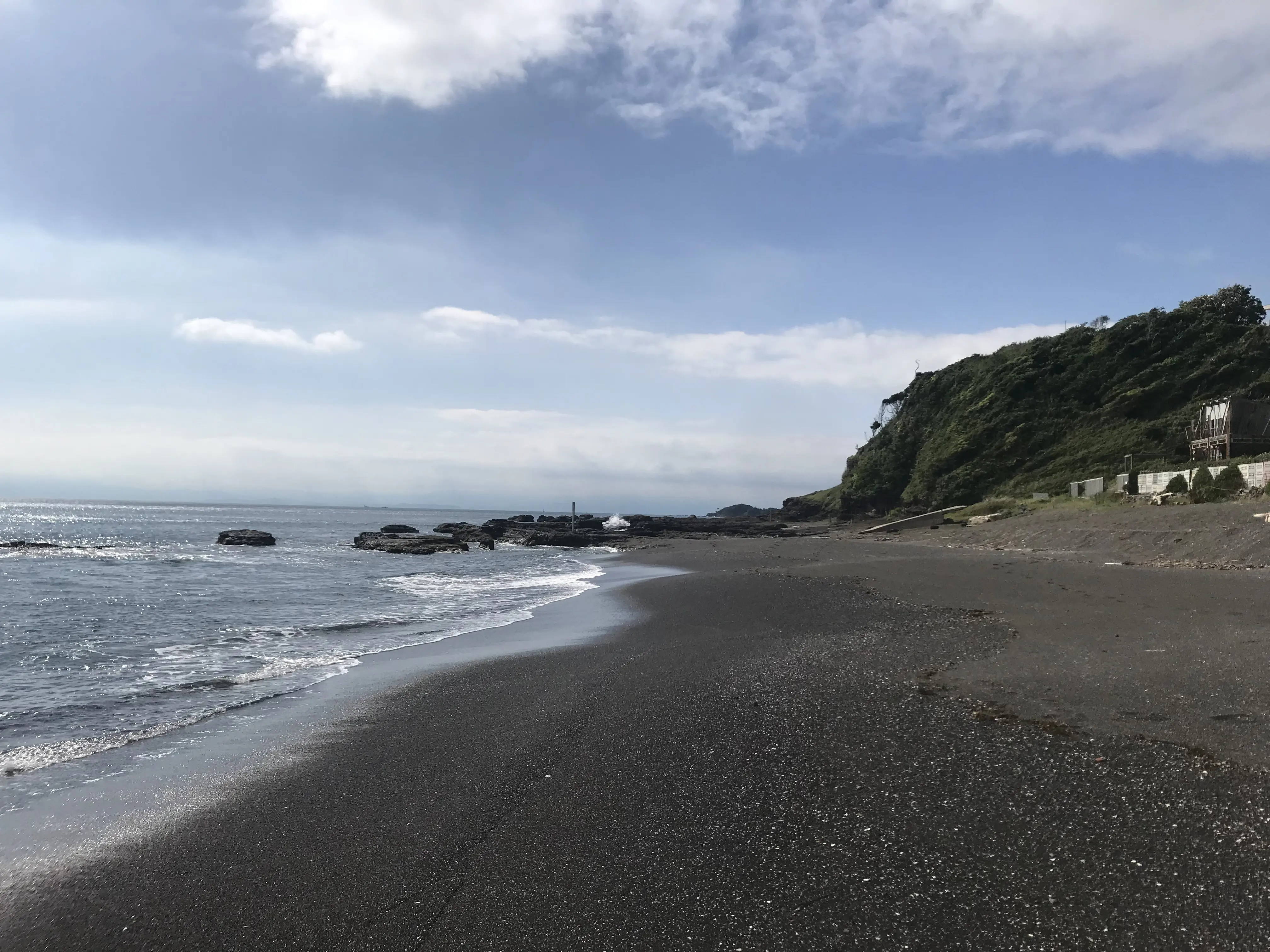 三崎口駅から徒歩30分で三戸浜に到着し、目的地の黒崎海岸にある貝殻スポットに行きました